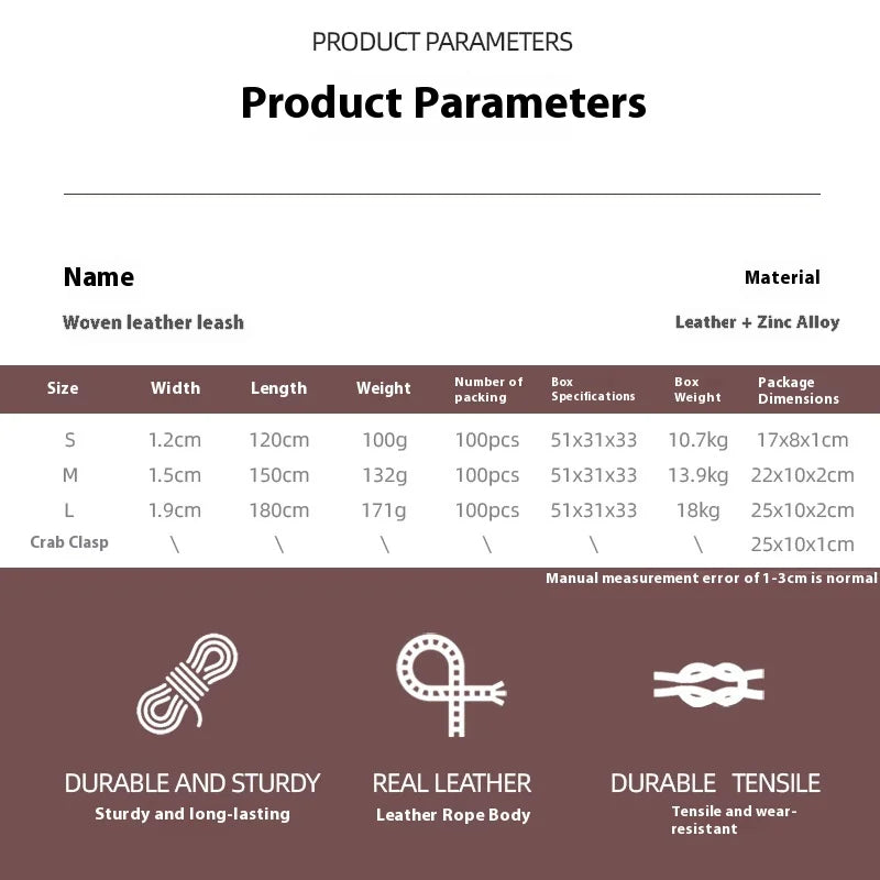 Handcrafted Top Grain Leather Dog Leash - Genuine Cowhide Woven Traction Rope for Small Medium Pets, Durable Pet Supplies