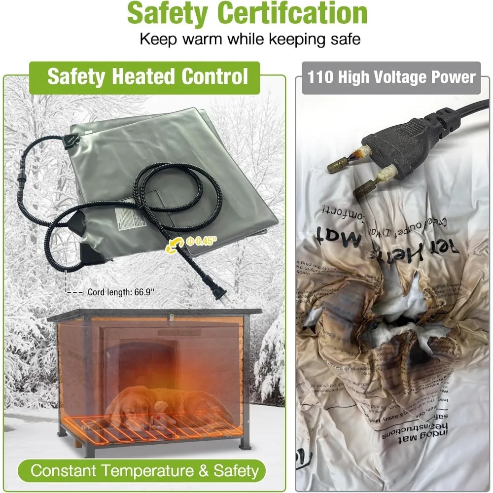 This dog house is designed to provide your pet with a warm and comfortable shelter. It features an automatic heating function with a UL-certified pad that keeps the temperature between 85 to 130°F, complete with overheating protection for safe warmth. The power cord is chew-resistant and 6.5 feet long, allowing for flexible outdoor placement while preventing damage from chewing. The dog house is equipped with a thermal liner that is 0.78 inches thick and flame-retardant, which helps retain heat and improve energy efficiency. The construction includes solid wood panels reinforced with thick iron frames and L-shaped connectors, making it durable, bite-resistant, and long-lasting. It is designed for all-weather outdoor use, with an openable asphalt roof for easy cleaning, a PVC door curtain to protect against wind and rain, and plastic foot covers that keep the kennel elevated and stable on wet ground.