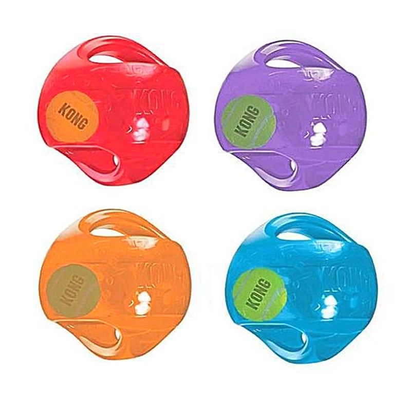 The KONG Jumbler is a two-in-one ball toy for twice the interactive fun in one paw-some toy. The interior tennis ball and loud squeak entice play, while the handles make pickup and shaking easy for both you and your playmate. With a combination of sounds and so many ways to play, the KONG Jumbler will ensure an exciting, active play session for you and your dog.