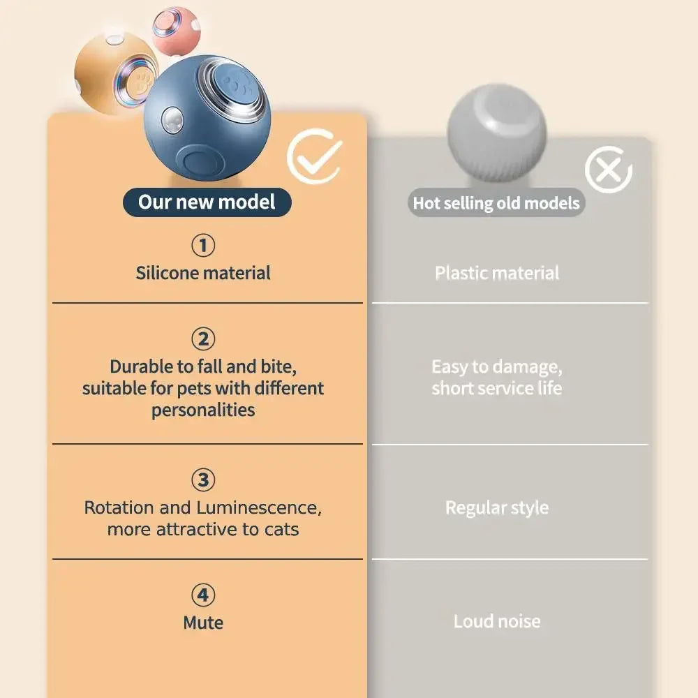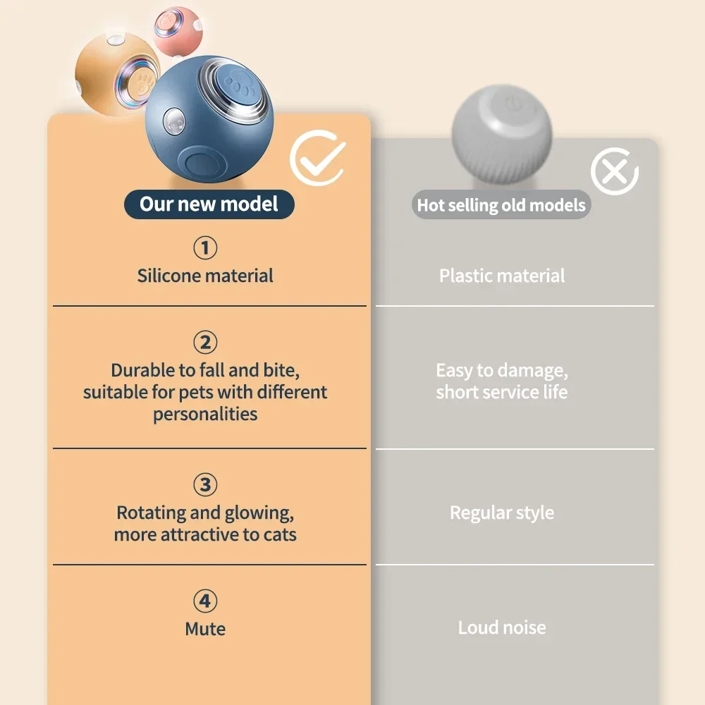 1. High quality material: Our material is high-quality silicone material, while other merchants' cat automatic balls are made of plastic material. Silicone material is elastic, resistant to falling and biting, suitable for pets of different body types and personalities. Long service life can bring your pet a longer and more enjoyable experience. Plastic cat balls from other merchants have a short service life and are prone to damage to internal parts.